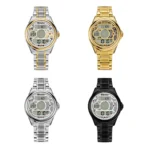نقدم لكم ساعة رقمية حديثة ومتطورة مع حزام من الفولاذ المقاوم للصدأ باللون الفضي / الذهبي المصقول.